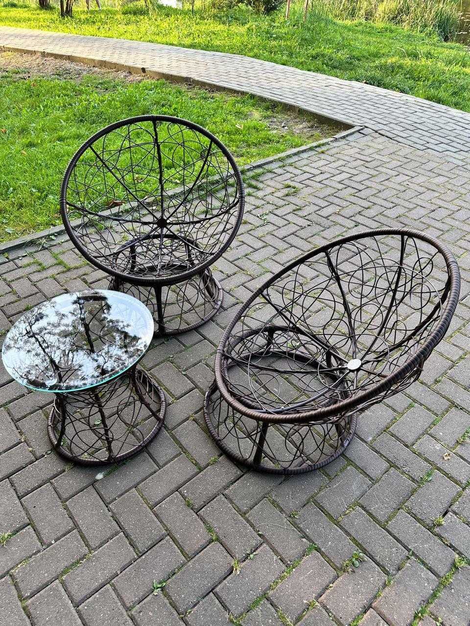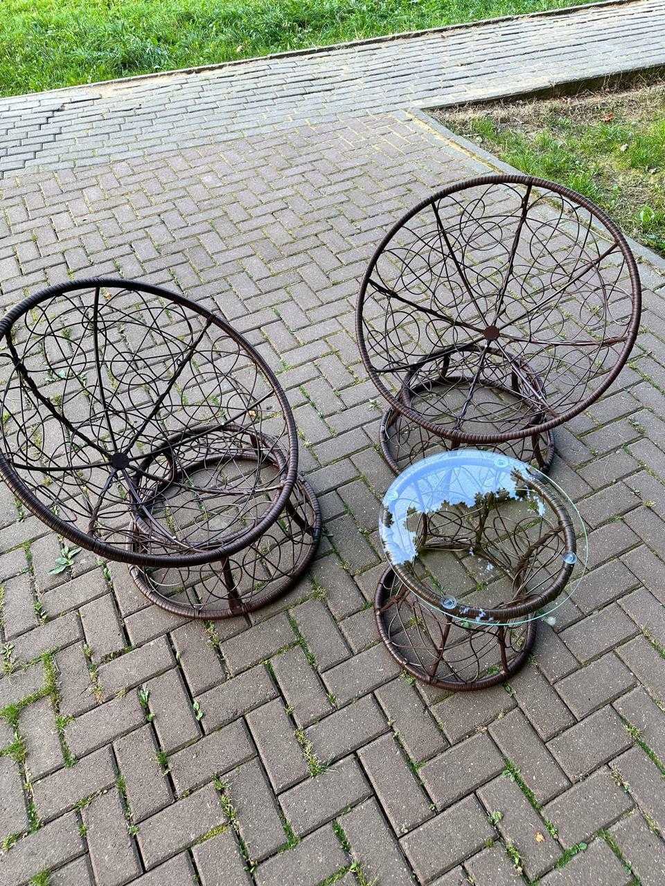 В садовый комплект входит: два кресла, две подушки и журнальный столик.